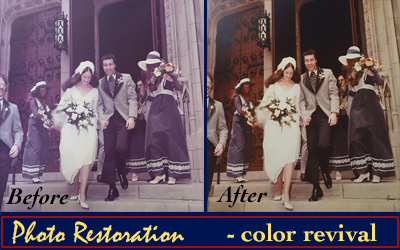Digital photo restoration is available on some projects. The photograph is scanned and then restored using editing programs and a new print is made. The original remains untouched. This is an option if you have a photograph that has endured light damage or scratches.